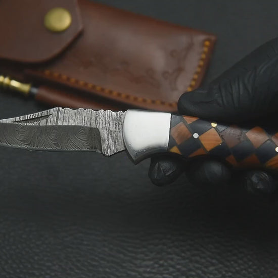 Celebrate this holiday season with the Artisan Folding Knife, a thoughtful and practical Christmas gift for men who value craftsmanship and style. Forged from premium Damascus steel, the blade ensures durability, sharpness, and long-lasting performance. Its wooden checkered handle, designed with vibrant natural tones, adds both elegance and a comfortable grip.