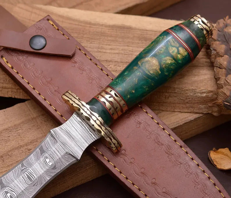 The green resin handle, accented with polished brass, adds an elegant, modern flair while providing a secure and ergonomic grip. Measuring 14 inches overall with a 9-inch blade, this athame is both a practical tool and a stunning collector’s item.